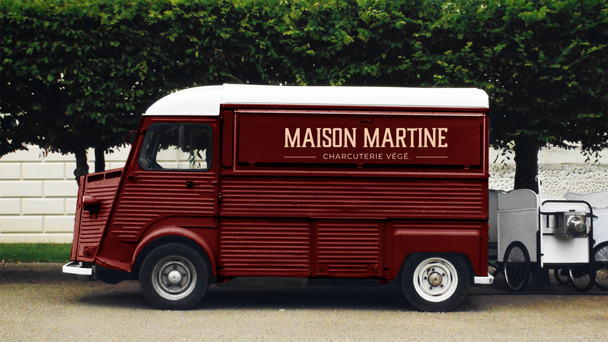 La palette de couleurs s'articule autour d'un rouge brique, un pourpre profond, un rose lardé - associés à un beige amande pour renforcer le contraste et l’aspect authentique. Cette approche permet de recréer l’esprit de la charcuterie traditionnelle tout en cassant les codes, sans tomber dans la caricature ni le dérisoire. L’univers visuel exprime un équilibre entre héritage et modernité, en cohérence avec la mission de la marque : proposer une charcuterie végétale haut de gamme.