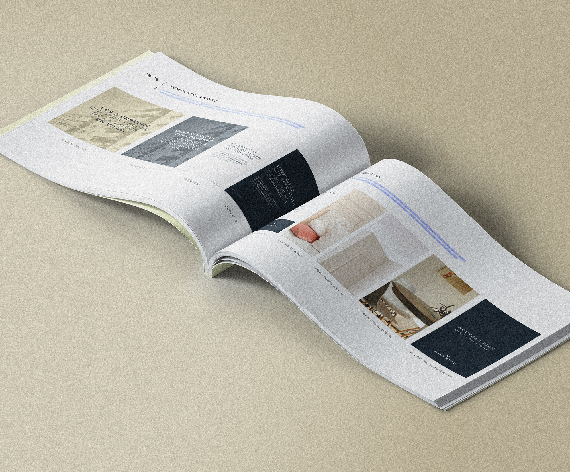 La direction artistique traduit le positionnement haut de gamme de District : typographies structurées, contrastes maîtrisés, palette élégante et hiérarchie visuelle nette.